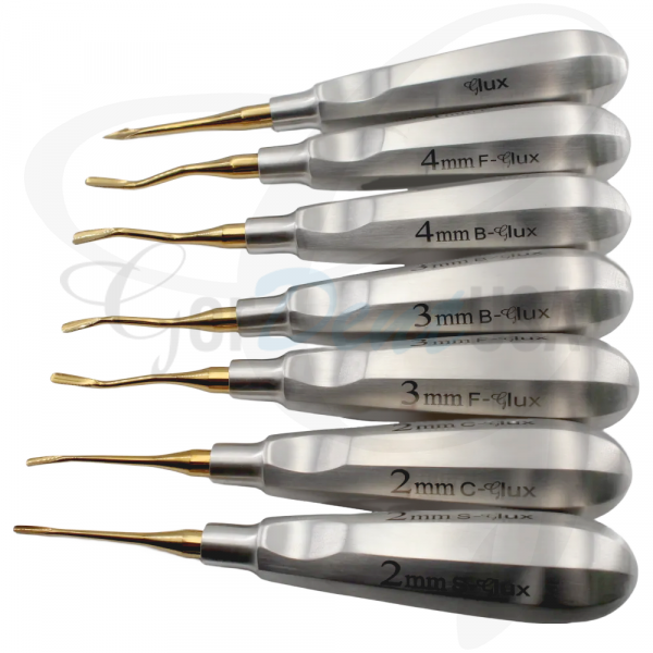 Glux Luxating set has high-quality instruments featuring atraumatic tips for effective luxation with minimal tissue trauma and patient discomfort. Their high-quality material makes them highly durable and resistant to corrosion. These sets of elevators feature instruments with varying tips, including forward-angled, backward-angled, straight, and spade tips.